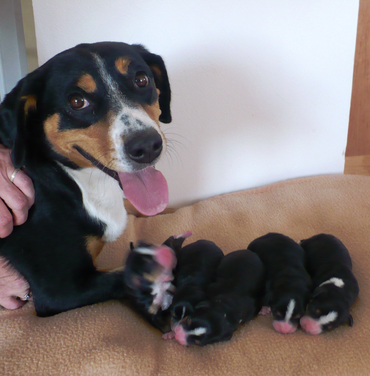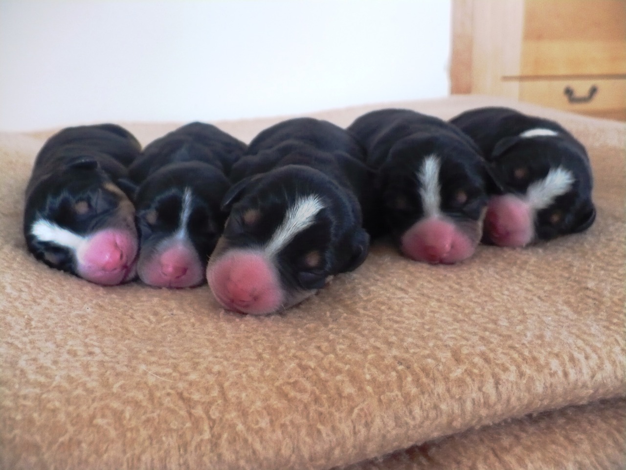 Hodnocení vrhu při přejímce: velmi pěkný vyrovnaný vrh, tmavých očí, dobrých tvarů, bez kýl. Spíše méně vyjádřeny bílé znaky.